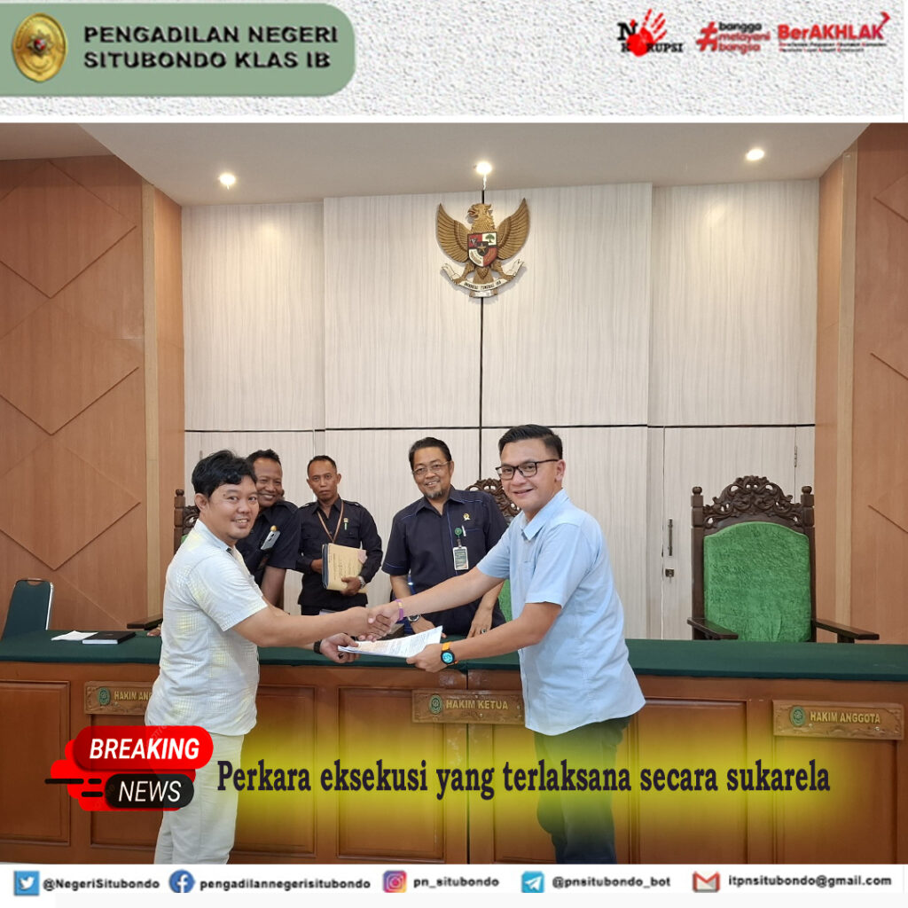 Bertempat di Ruang sidang utama Kantor Pengadilan Negeri Situbondo, pada hari selasa 12 Nopember 2024 pukul 13:00 WIB telah dilaksanakan penandatanganan berita acara pelaksanaan eksekusi dengan nomor register permohonan eksekusi nomor 10/Pdt.Eks/2024/PN Sit Jo 50/Pdt.G/2021/PN Sit