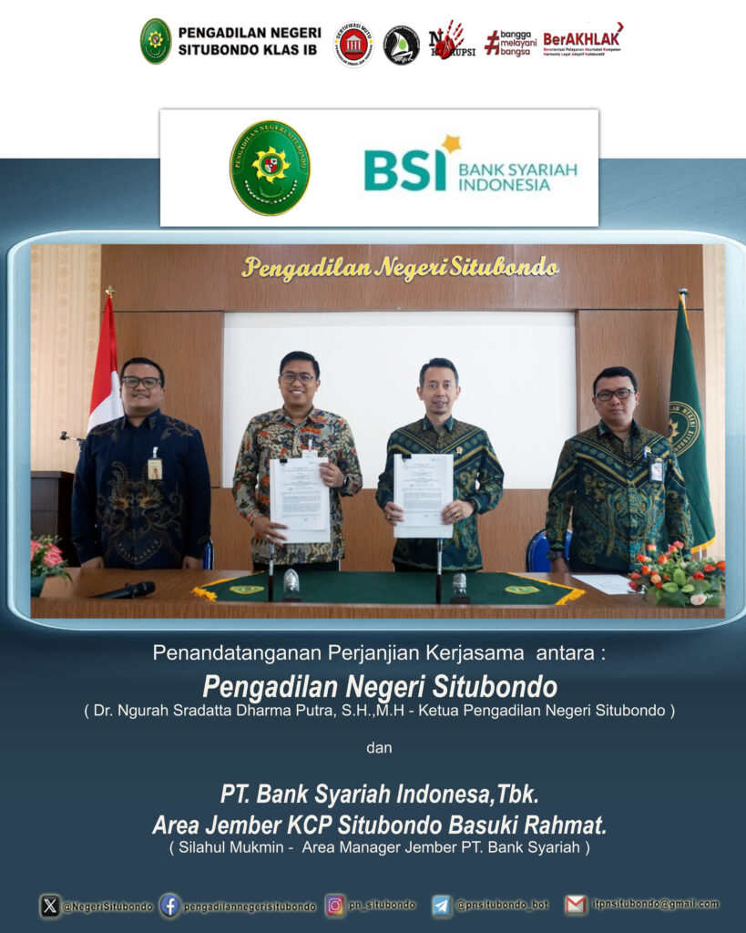 Pengadilan Negeri (PN) Situbondo Kelas IB secara resmi menjalin kemitraan strategis dengan PT Bank Syariah Indonesia Tbk. (BSI).