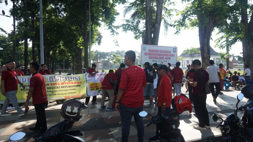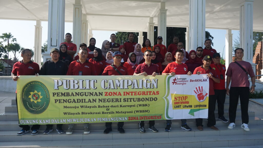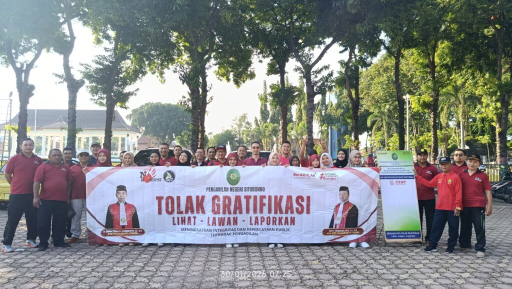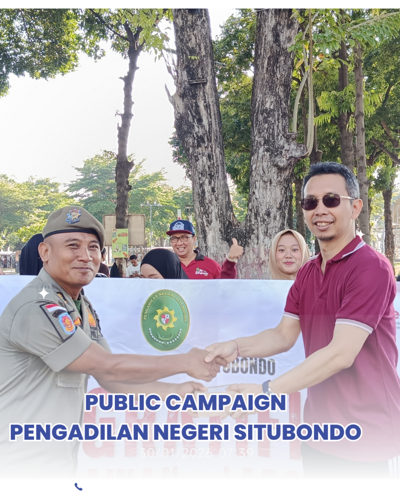 Jumat, 30 Januari 2026, Alun-Alun Kabupaten Situbondo menjadi saksi aksi nyata Pengadilan Negeri Situbondo dalam memperkuat integritas melalui kegiatan Public Campaign. Dipimpin langsung oleh Ketua PN Situbondo, Bapak Dr. Ngurah Suradatta Dharmaputra, S.H., M.H., bersama Wakil Ketua, Bapak Haries Suharman Lubis, S.H., M.H., seluruh keluarga besar PN Situbondo—mulai dari jajaran Hakim, Panitera, Sekretaris, hingga seluruh Pejabat Struktural, Fungsional, dan staf—turun menyapa masyarakat untuk menyuarakan semangat birokrasi yang bersih. Kegiatan ini bertujuan untuk mempertegas posisi PN Situbondo sebagai institusi yang anti-gratifikasi dan bebas dari segala bentuk pungutan liar.